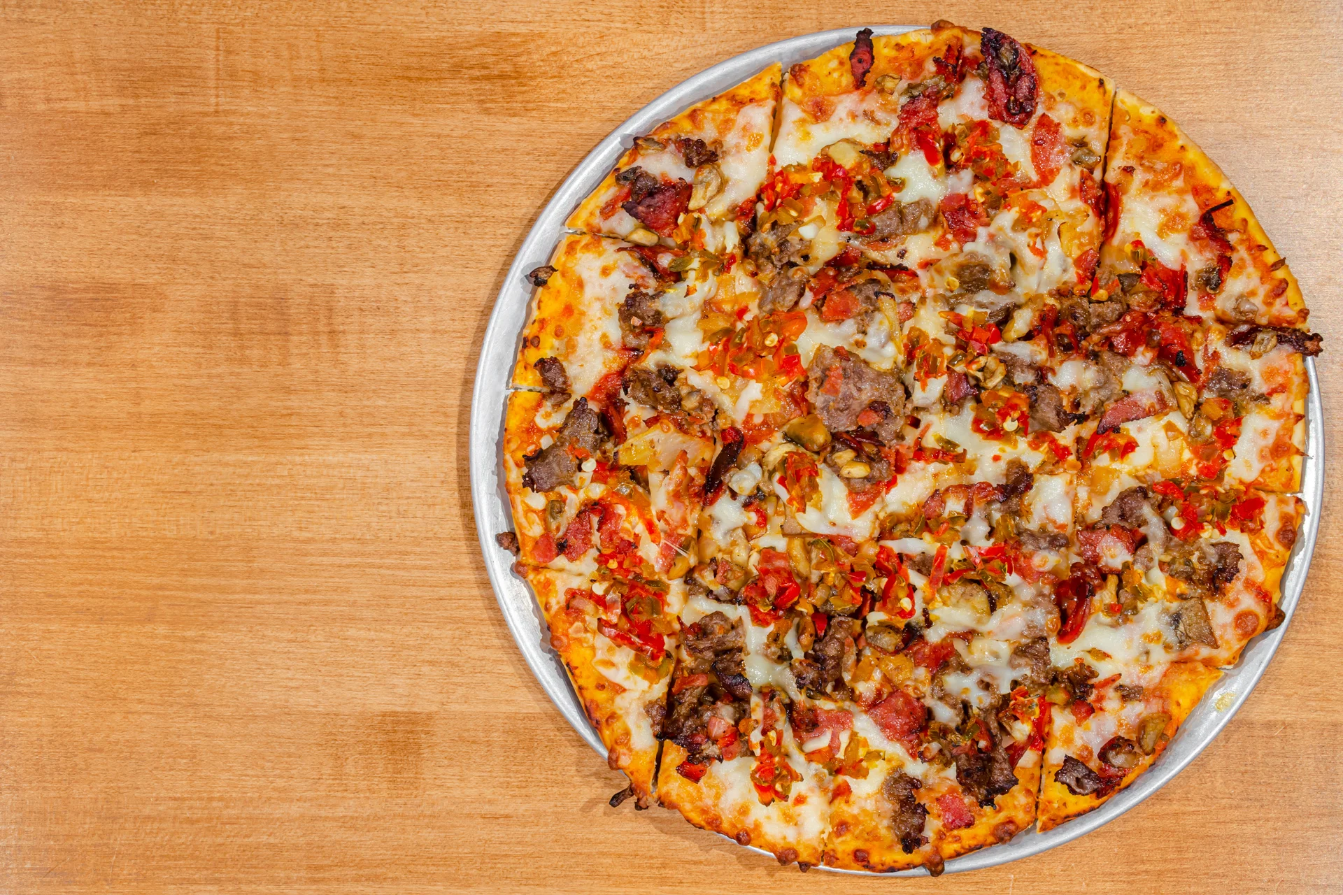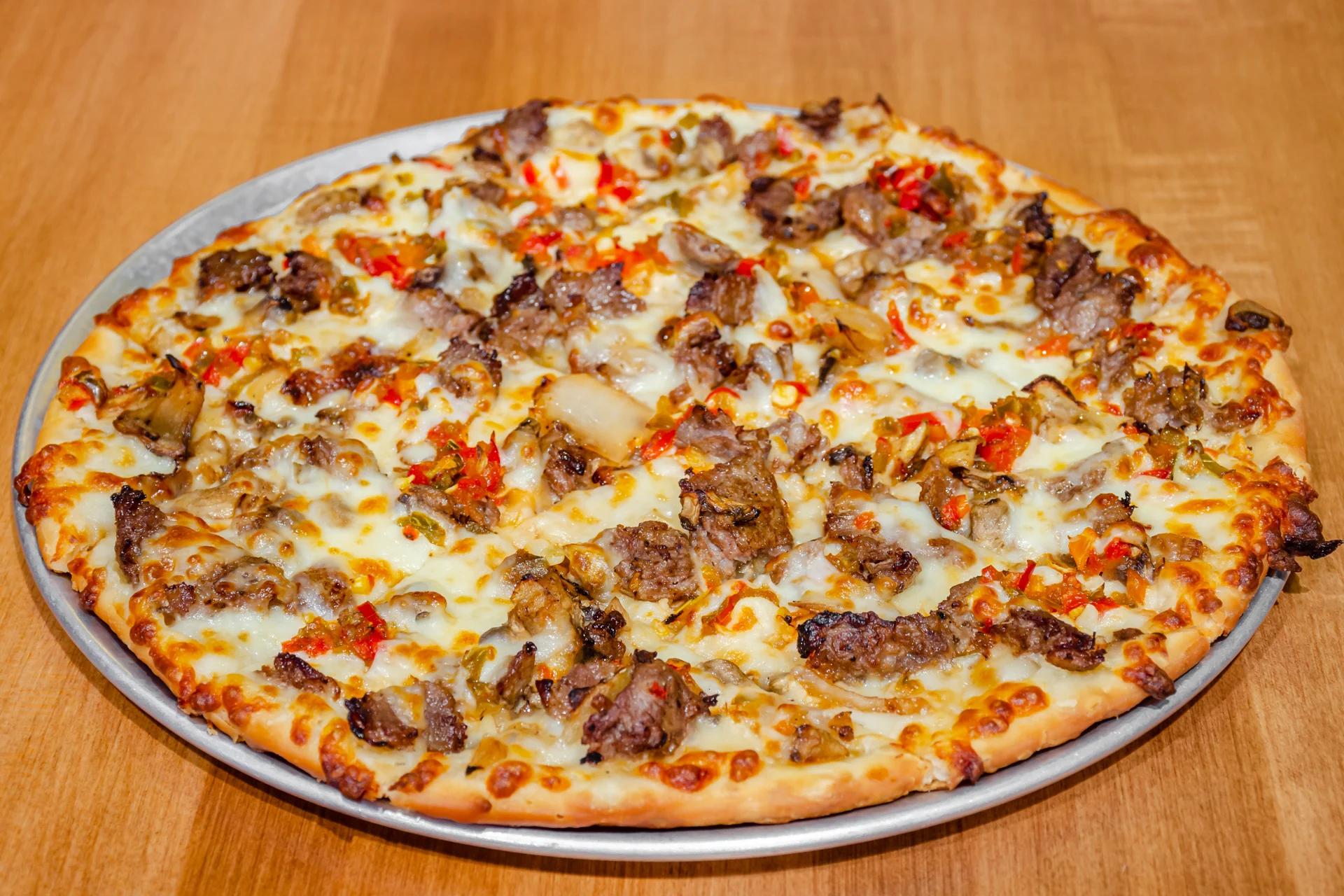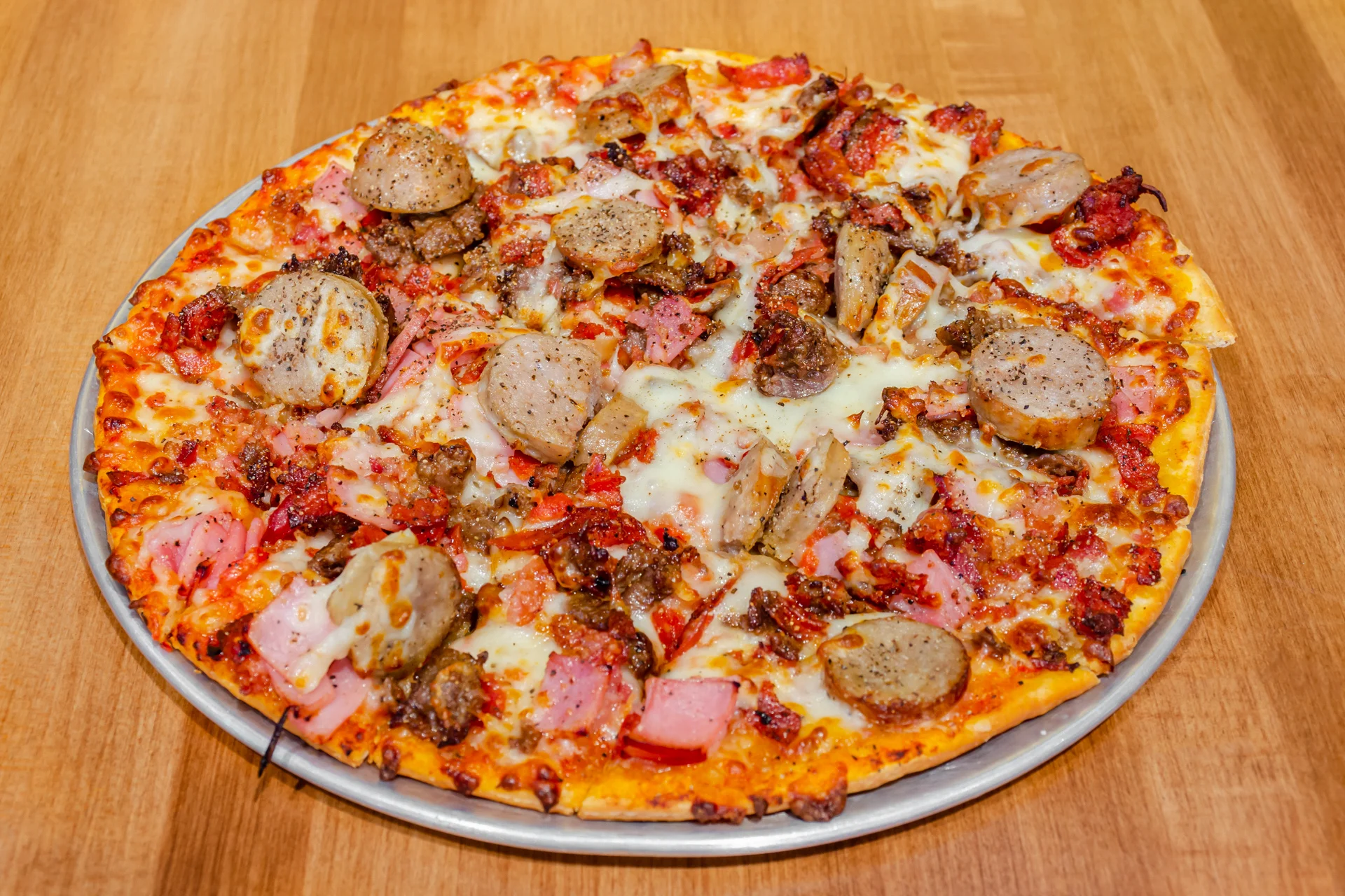 Marinara sauce, cheese, grilled steak, pepperoni, Italian sausage, ham, & bacon