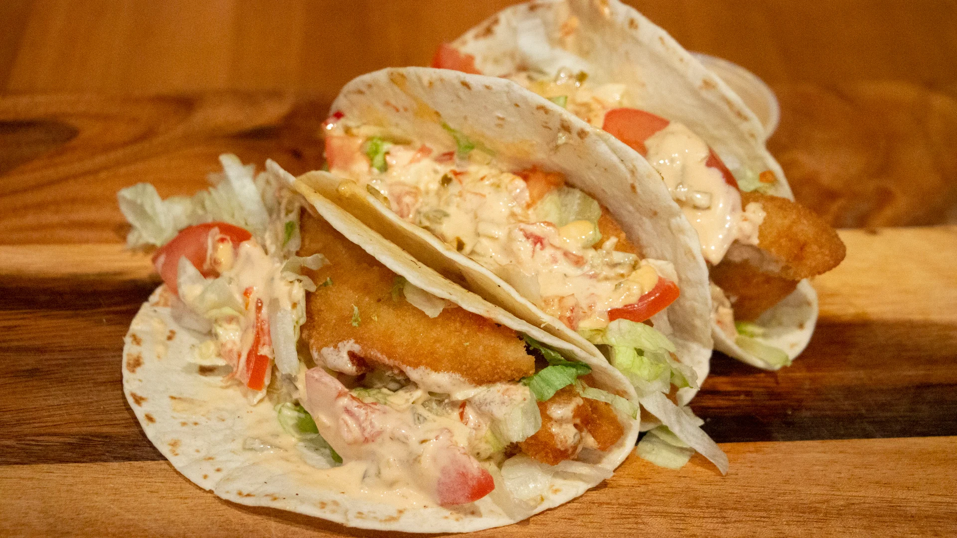 3 flour tortillas full of succulent lightly battered white fish. Topped with lettuce, tomato, & our house chipotle pepper relish. Comes with a side of our House Chips.