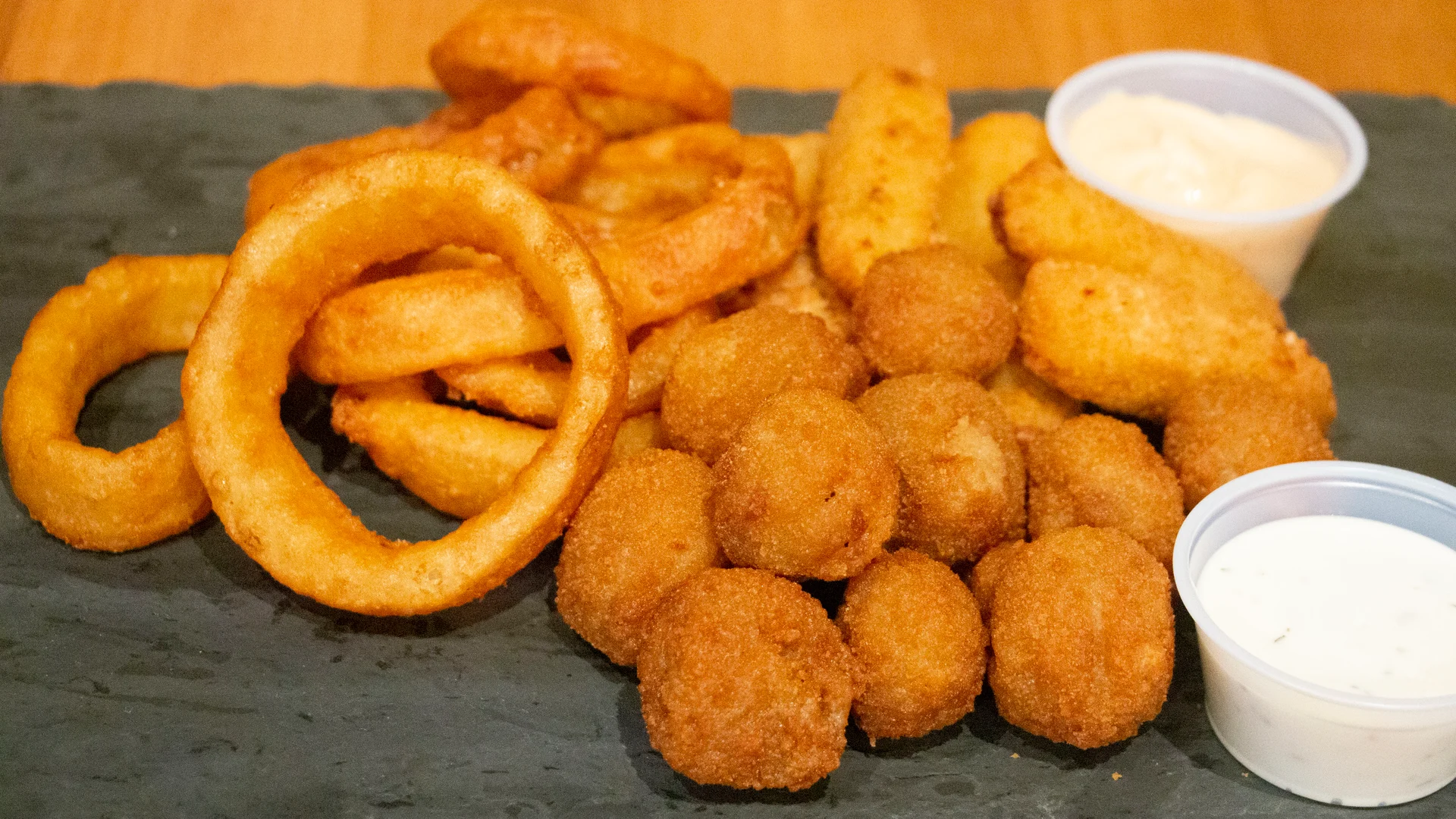 Choice of 3: teezers, onion rings, fried mushrooms, house fries, or house chips choice of 2 sauces: nacho cheese, ranch, pepper relish, BBQ, cocktail, sour cream, or chipotle mayo