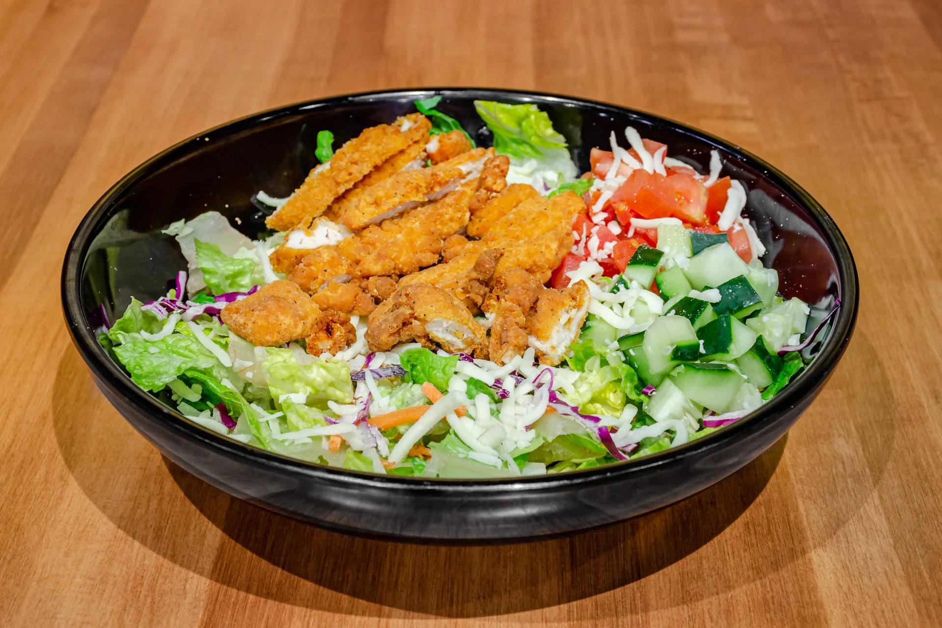 Fresh salad greens with tomato & cucumber, topped with tender crispy chicken & cheese