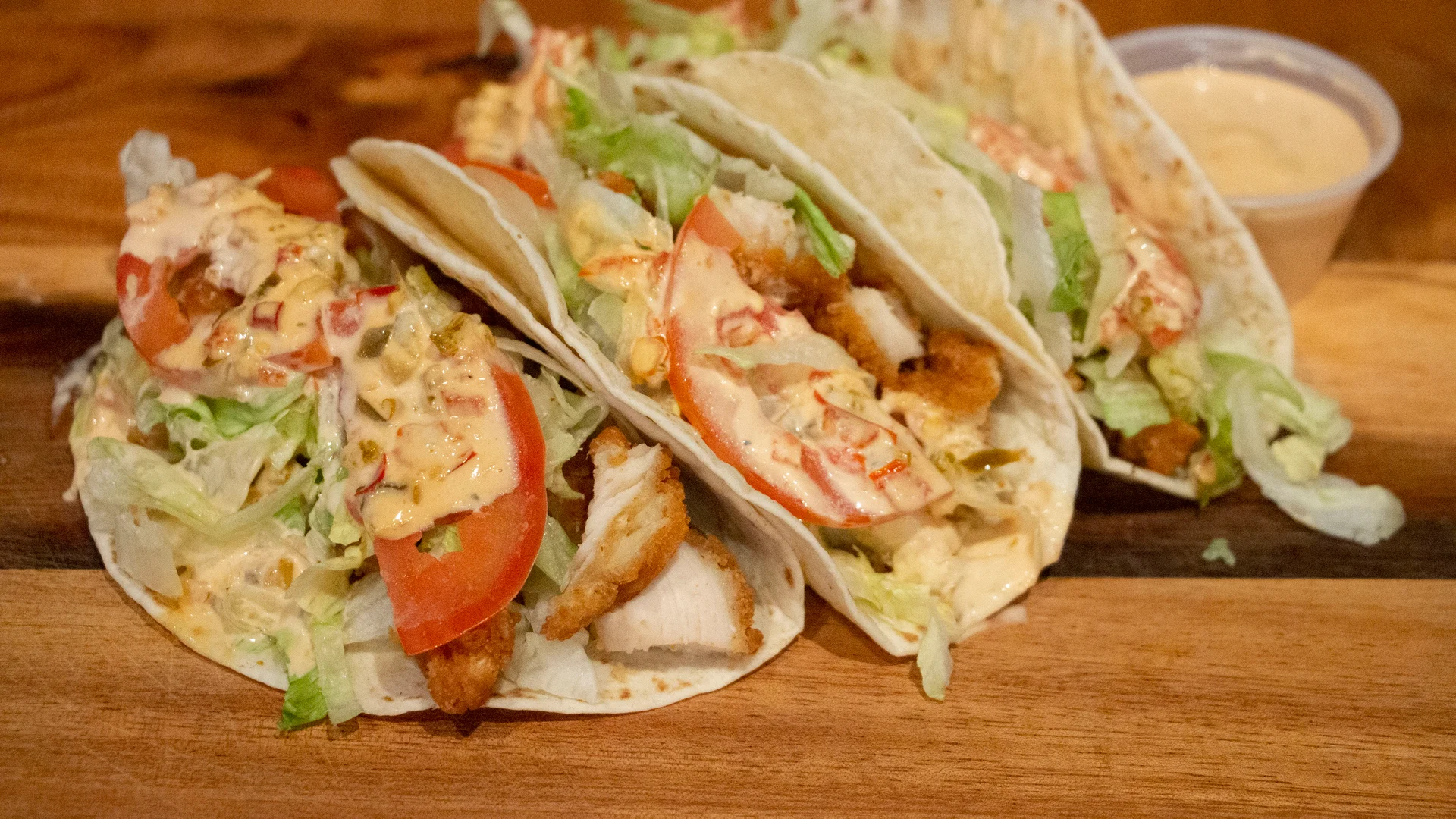 3 flour tortillas filled with spicy crispy chicken. Topped with lettuce, tomato, & our house chipotle pepper relish. Comes with a side of House Chips.