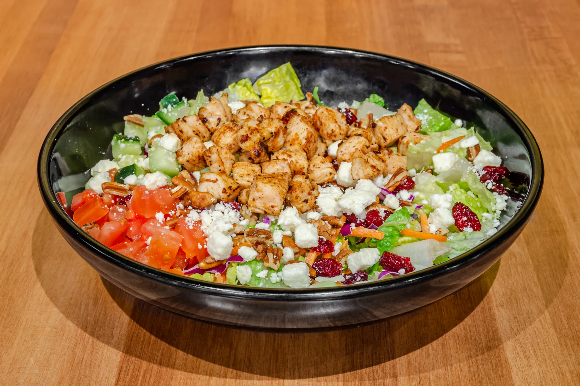 Fresh salad greens with tomato & cucumber, topped with grilled chicken, pecans, feta cheese & dried cranberries. Served with balsamic vinaigrette dressing