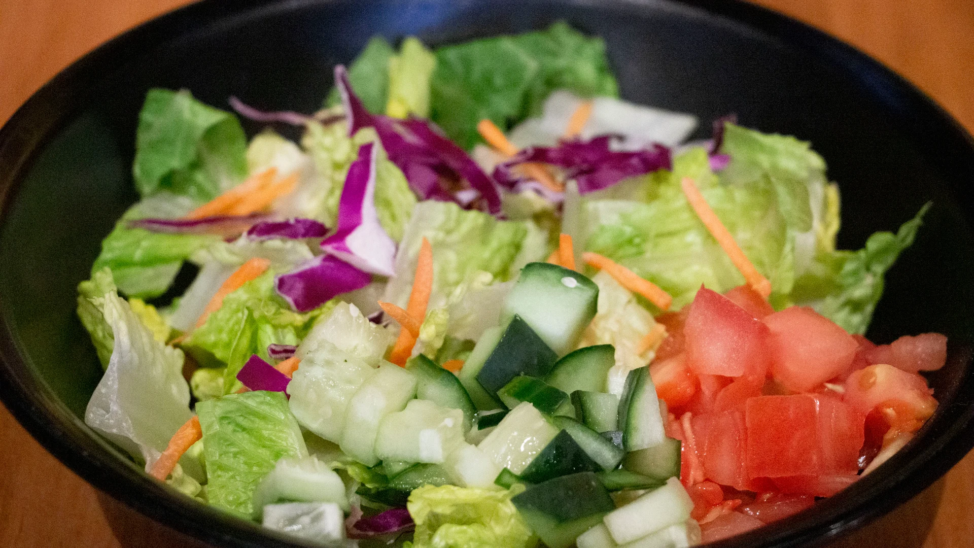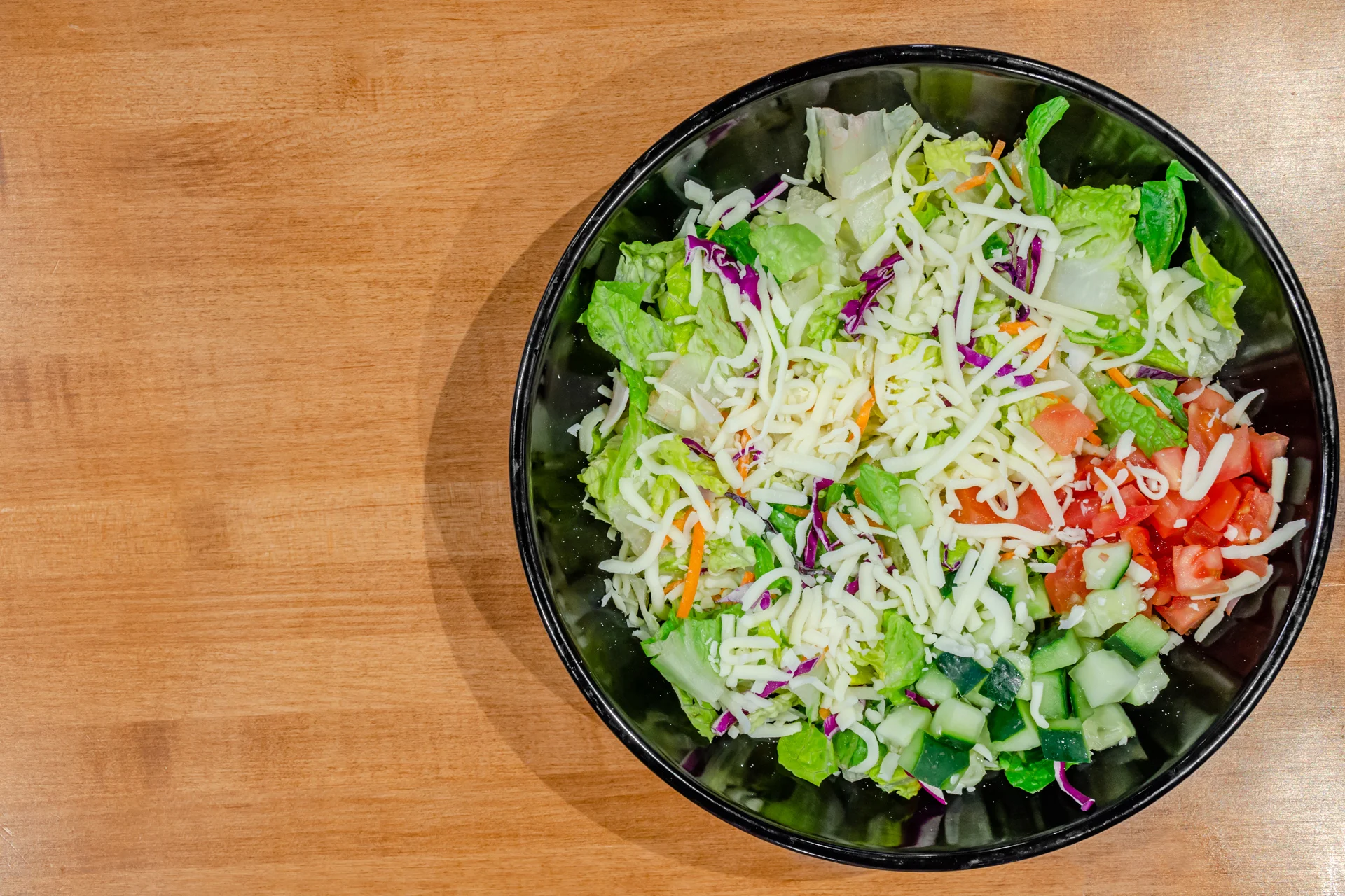 Fresh salad greens with tomato & cucumber, topped with juicy grilled chicken, mushrooms, onions, & cheese