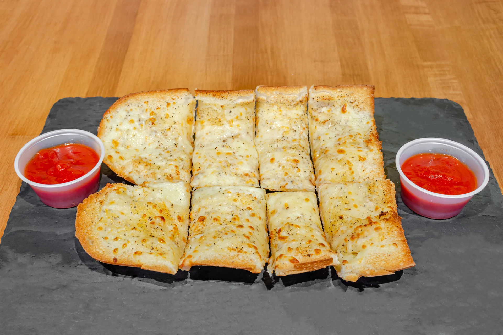 Buttery garlic bread topped with melted mozzarella cheese, served with a side of marinara sauce