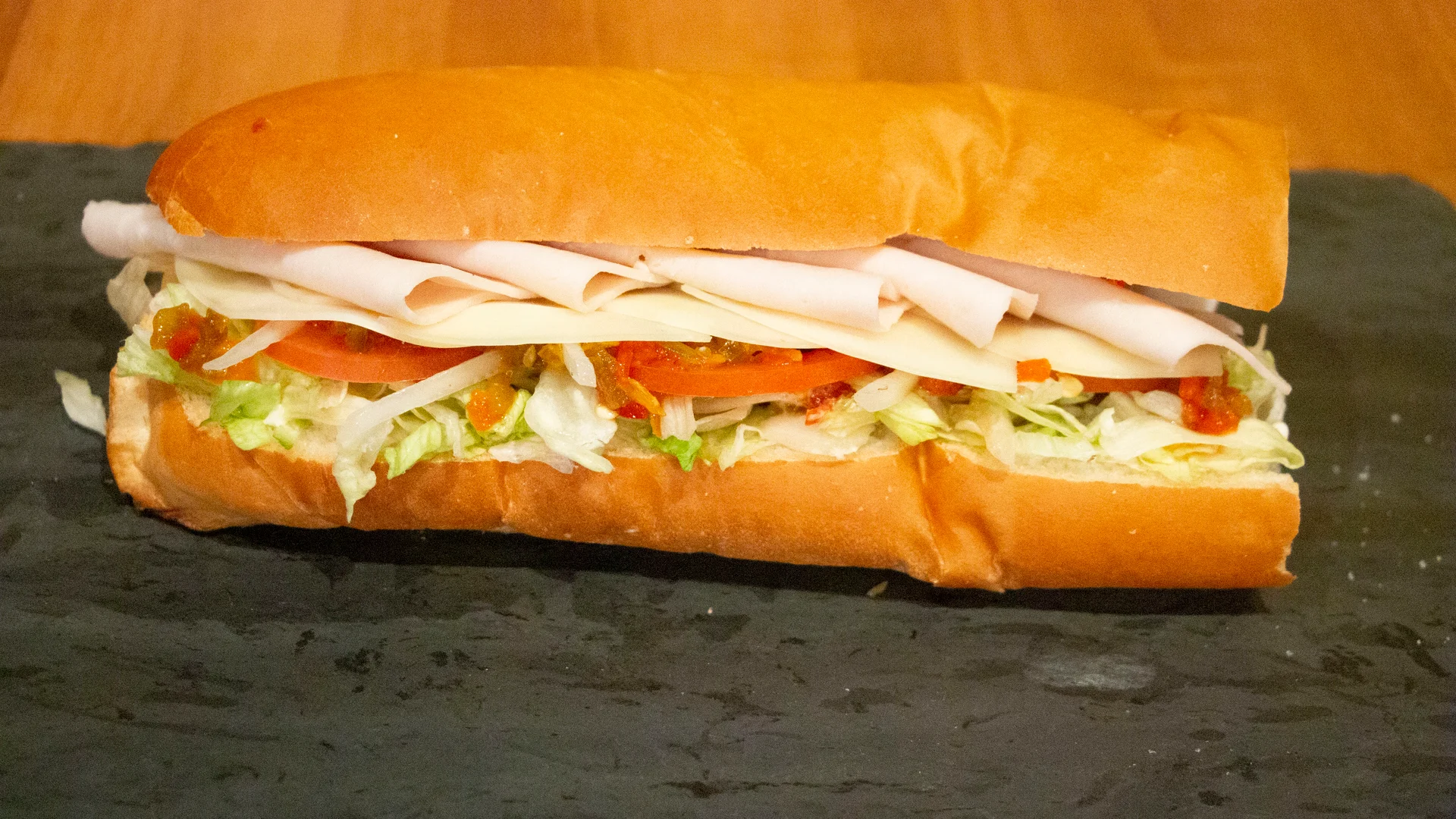 Oven roasted turkey, provolone cheese, & the works". Comes with a side of our House Chips.