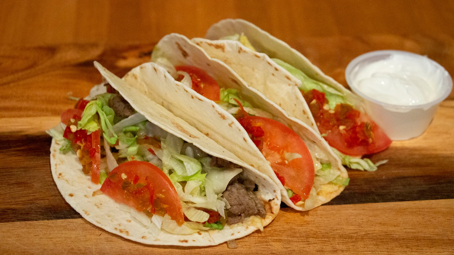 3 flour tortillas with your choice of grilled steak or chicken, grilled with onions, mushrooms, & cheese. Topped with lettuce, tomato, & pepper relish. Served with a side of sour cream. Comes with an order of our House Chips.