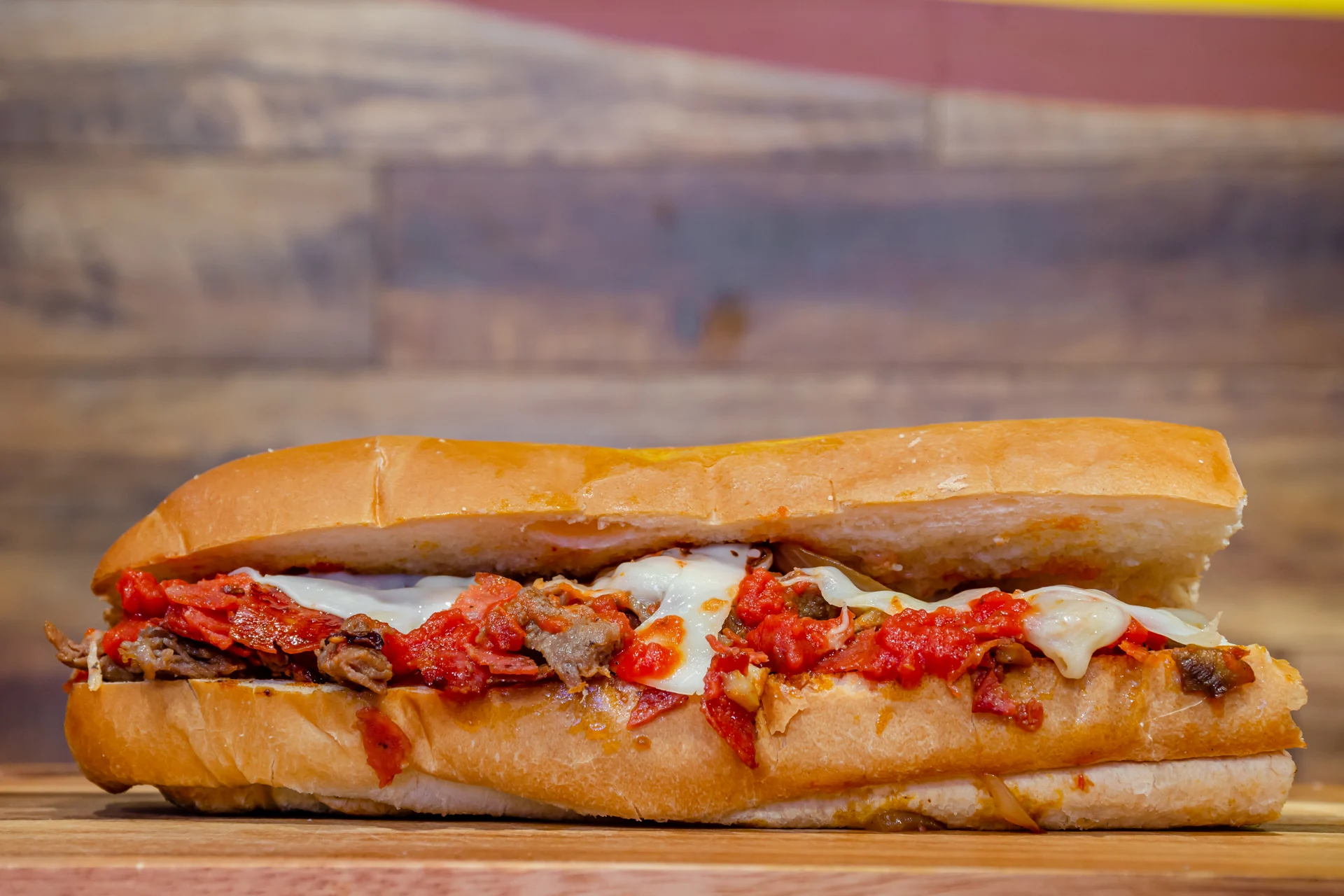 Grilled steak, pepperoni, provolone & swiss cheese, onions, mushrooms, & marinara sauce. Comes with a side of our House Chips.