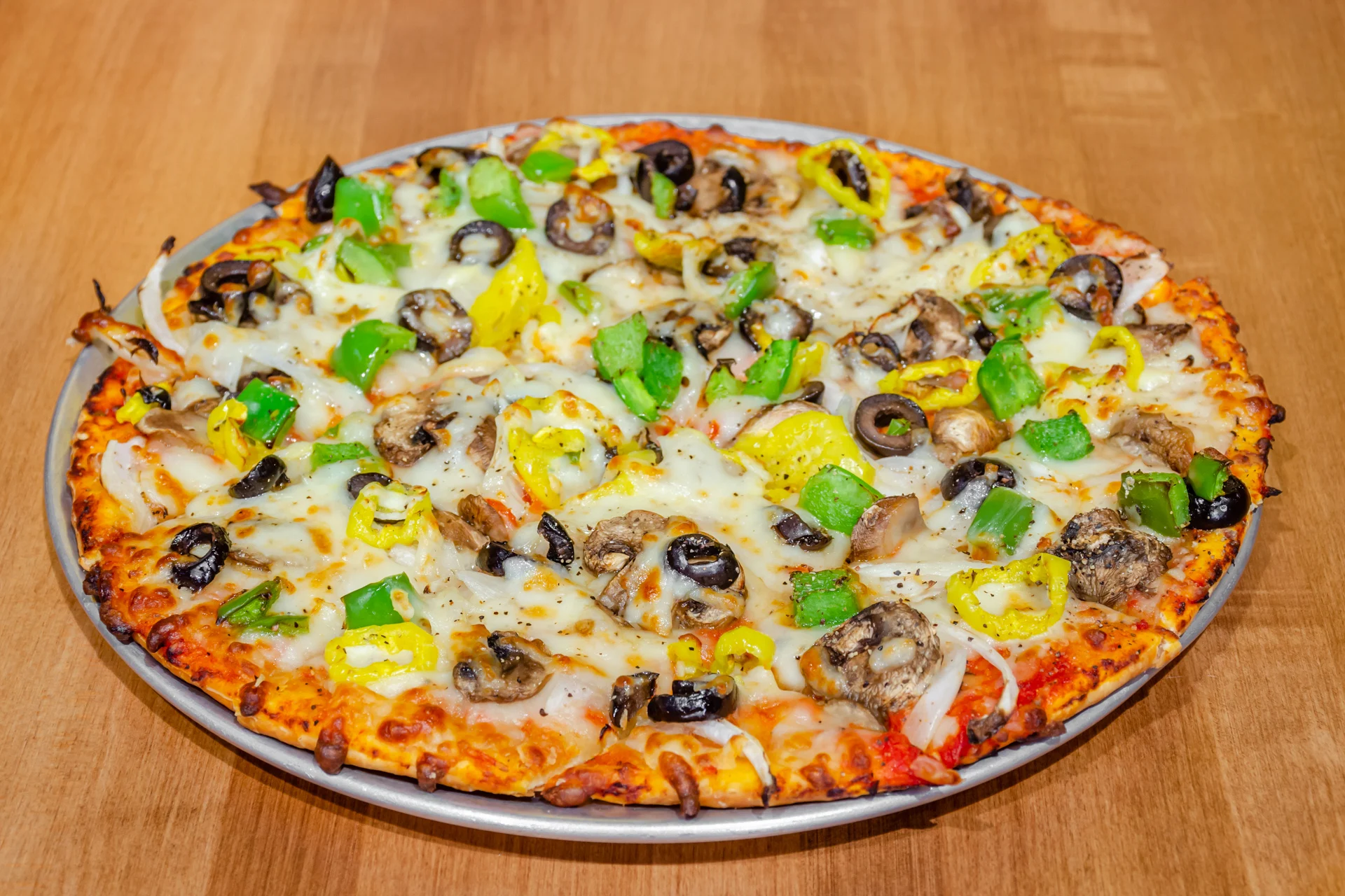 Marinara sauce, cheese, mushrooms, onions, green peppers, banana peppers & black olives
