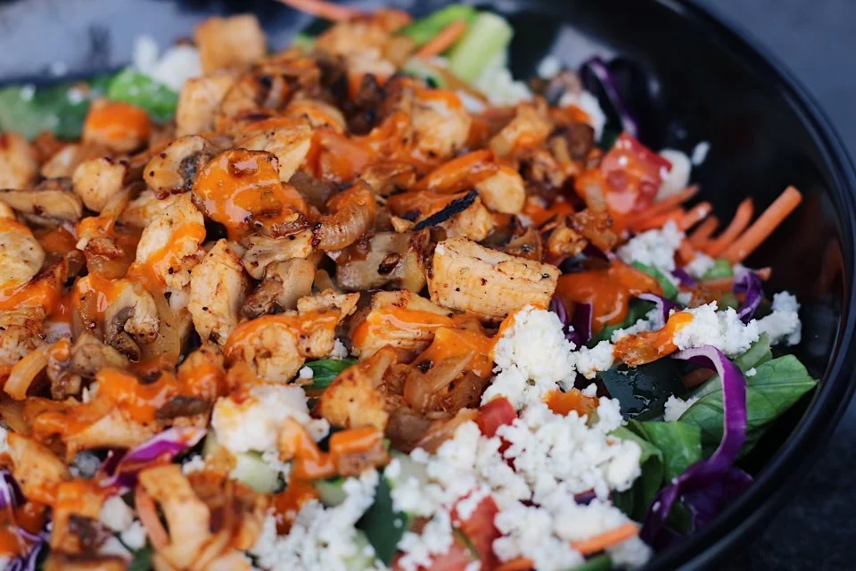 Fresh salad greens with tomato & cucumber, topped with juicy grilled chicken tossed in garlic buffalo sauce, with onions, mushrooms, and blue cheese crumbles. Served with your choice of dressing.