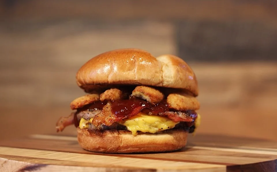 Fresh 7oz all beef patty topped with Honey Sriracha sauce, grilled banana peppers, & provolone cheese, topped with a crispy onion ring. Served with house fries.